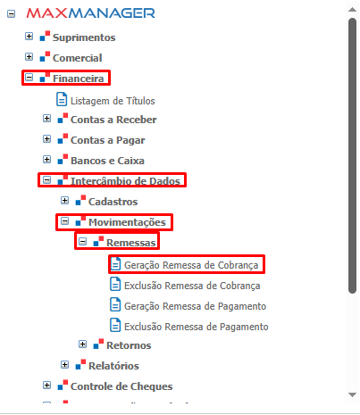 O MaxManager oferece um recurso para o intercâmbio eletrônico de dados entre a empresa e seus bancos parceiros. O procedimento de geração de remessa de cobrança depende de pré-requisitos essenciais: