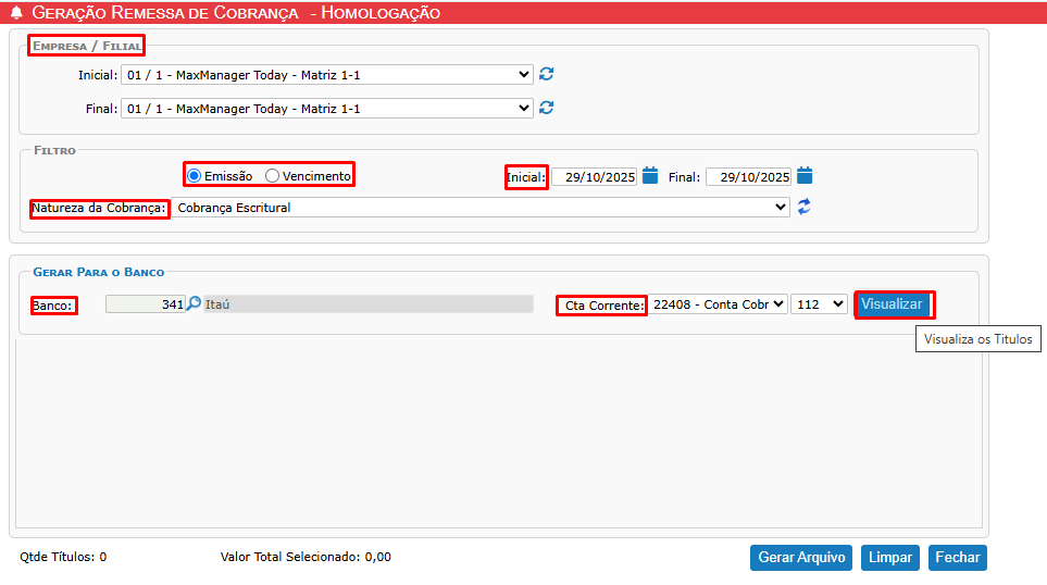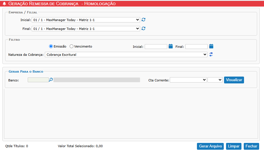 Ao acessar a tela, você deverá efetuar os filtros necessários para apresentação dos títulos disponíveis para geração do arquivo de remessa.