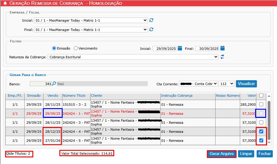 ⚠️ Atenção à Regra de Elegibilidade: O MaxManager somente disponibilizará para a geração final os títulos que estiverem em aberto e que ainda não estiverem vencidos na data da remessa.