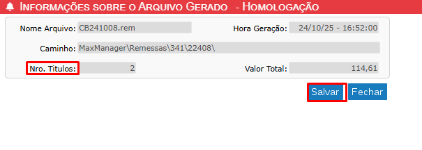 - Tela de Conferência: O sistema exibirá uma tela de confirmação, detalhando a quantidade de títulos e os valores totais que serão incluídos no arquivo. Esta tela também indica o caminho onde o arquivo será salvo.