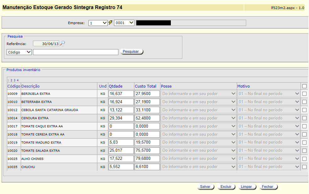 7) Ao entrar na tela, selecione a empresa/filial e a data de referência que utilizou na geração, ao selecionar a data, todos os produtos gerados naquela data para a filial serão apresentados, disponibilizando as colunas de quantidade e custo total para serem ajustados manualmente;