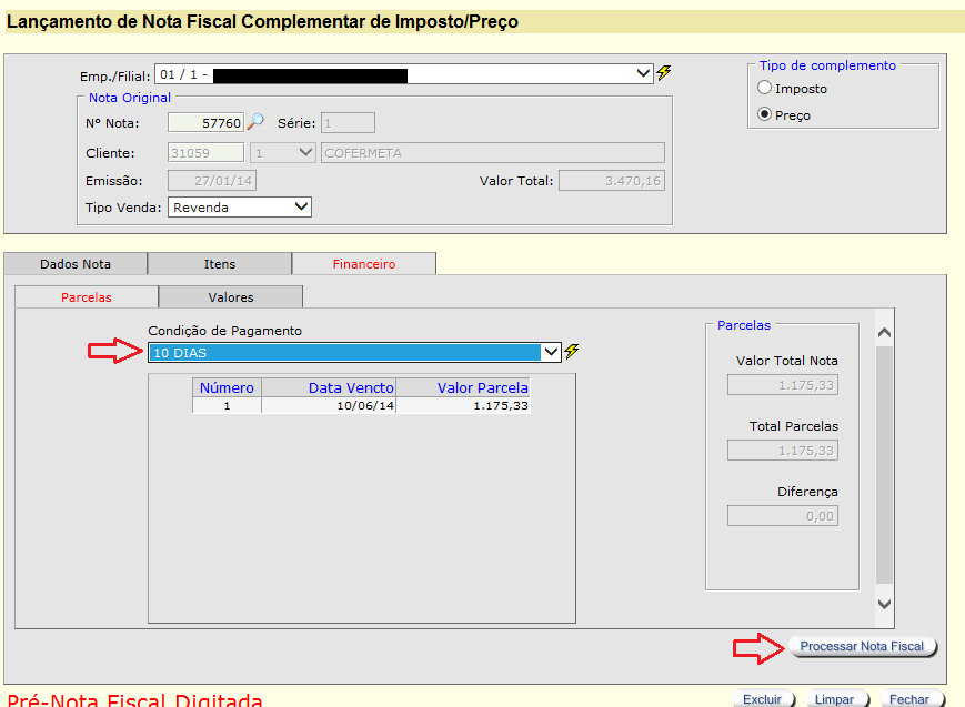 6) Seleciona uma condição de pagamento para gerar a cobrança do complemento para o seu cliente e clique no botão Processar Nota Fiscal;