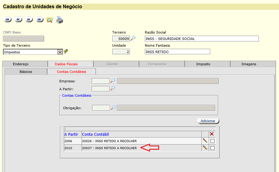 Ao entrarmos no cadastro de unidades de negócio e selecionarmos este fornecedor, vemos que a conta contábil relacionada a ele é que possui o código tradutor de número 20037.
