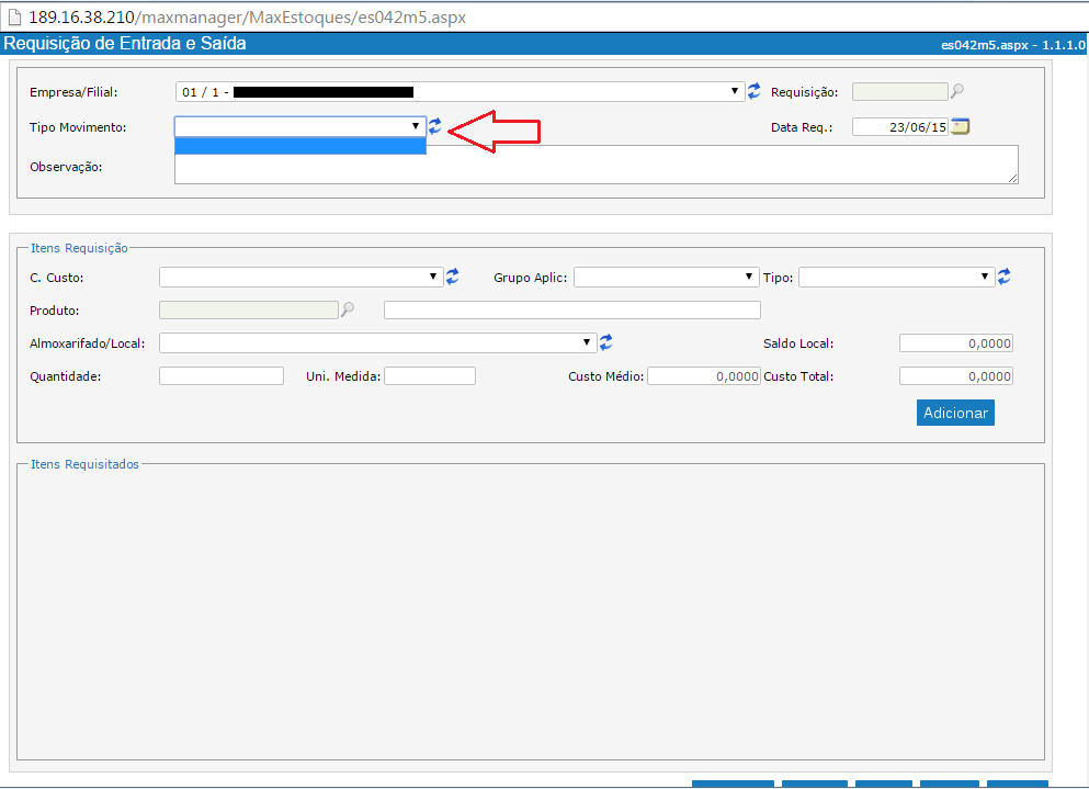 Ao entrar na opção Suprimentos / Estoque e Almoxarifado / Almoxarifado / Movimentações / Requisição de Entrada e Saída, não aparece disponivel nenhum tipo de movimento de estoque para ser utilizado.