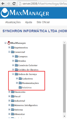 O módulo da ordem de serviço esta hospedado na gestão comercial, na estrutura de menus do MaxManager, conforme a imagem abaixo: