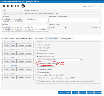Caso deseje que o custo da última entrada do produto, seja utilizado na integração da nota fiscal de entrada de devolução, desmarque a opção “Gera Custo para o Estoque”, agora se desejar que o custo utilizado na nota fiscal de saída seja utilizado, então você deverá deixar esta opção selecionada.