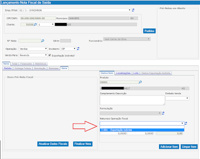 Em seguida vá até a aba de itens, selecione o produto, neste momento você observará que ficará disponivel somente o CFOP de exportação indireta para ser selecionado, isto acontece por causa do campo Exportação Indireta que foi selecionado, de acordo com a imagem anterior.