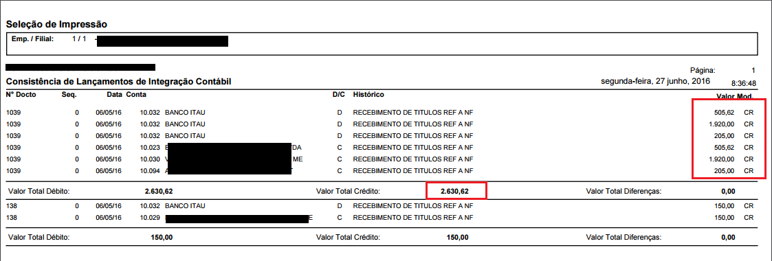 | Relatório da consistência da integração contábil |