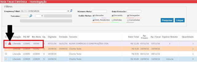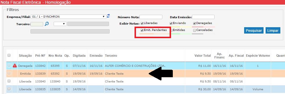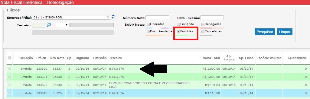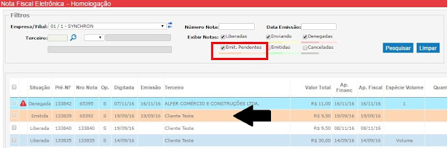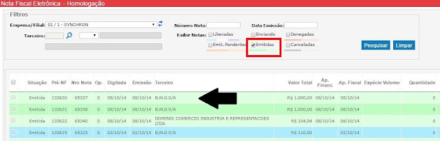 Após ajustar as pendências da nota emitida, a mesma fica com a cor verde na linha, conforme imagem abaixo: