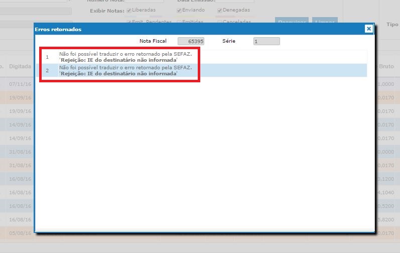 Caso essa nota não passe por alguma validação, o sistema abre um modal na tela informando o porque da rejeição, conforme imagem abaixo: