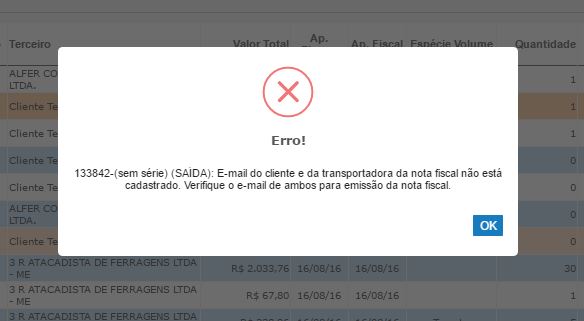 Conforme representado na mensagem de erro na imagem acima, para essa nota ser validada no MaxManager, será necessário ajustar o e-mail da unidade de negócio e/ou da transportadora.