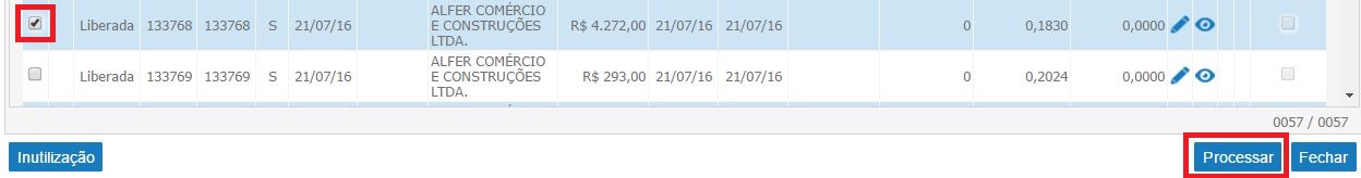 Filtre por LIBERADAS, dessa forma a tela trará apenas as notas a serem emitidas. Basta marcar as notas desejadas e clicar em PROCESSAR, conforme imagem abaixo:
