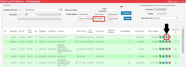 Vale ressaltar que uma CC-e só pode ser lançada para uma NF-e já enviada e autorizada pela SEFAZ. Contudo, é interessante na tela de Nota Fiscal Eletrônica já filtrar as notas fiscais por EMITIDAS.