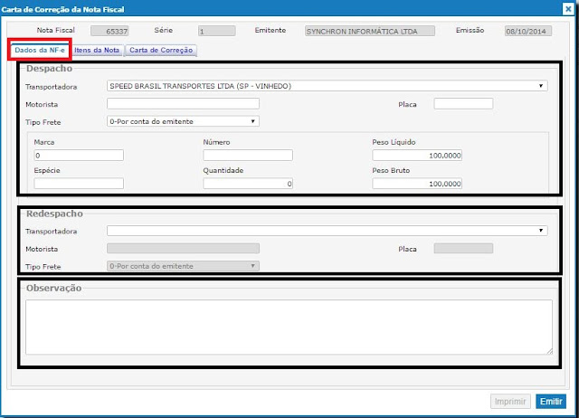 A Carta de Correção de Nota Fiscal pode ser usada para corrigir dados de transporte da mercadoria, tanto no despacho quanto no redespacho, representado na imagem acima.