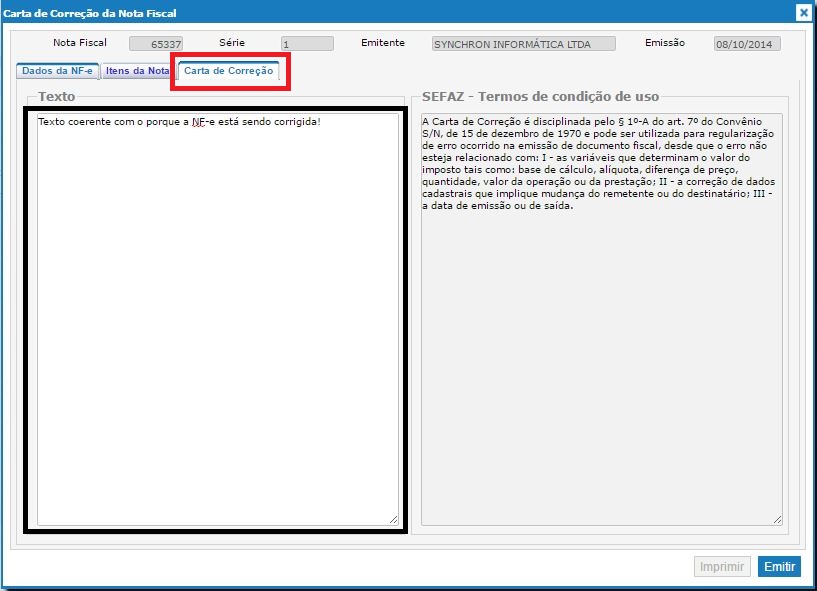 Assim que a CC-e estiver preenchida, basta clicar no botão EMITIR, como na imagem abaixo: