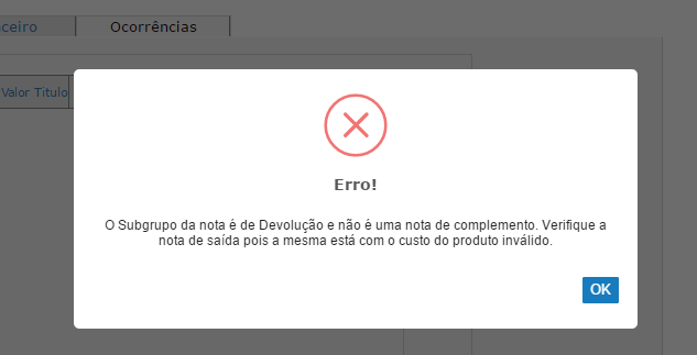 “O Subgrupo da nota é de Devolução e não é uma nota de complemento. Verifique a nota de saída pois a mesma está com o custo do produto inválido.”