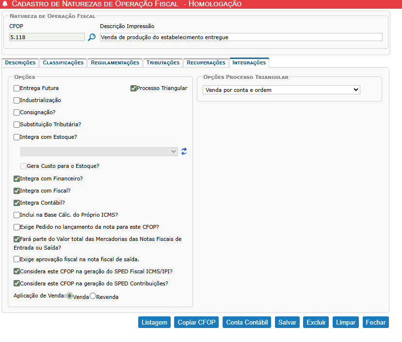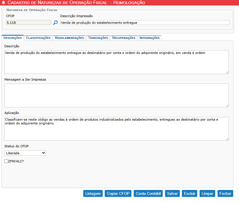 Após acessar a tela e inserir o cadastro de um novo CFOP com os códigos 5.118/6.118 ou 5.119/6.119, siga os seguintes passos abaixo: