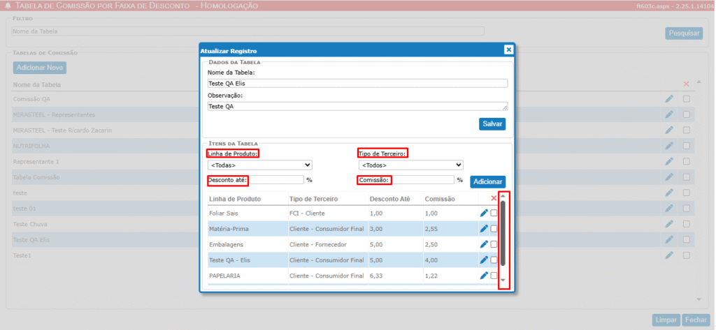 - Configure a tabela de descontos que será utilizada para o cálculo de comissão.