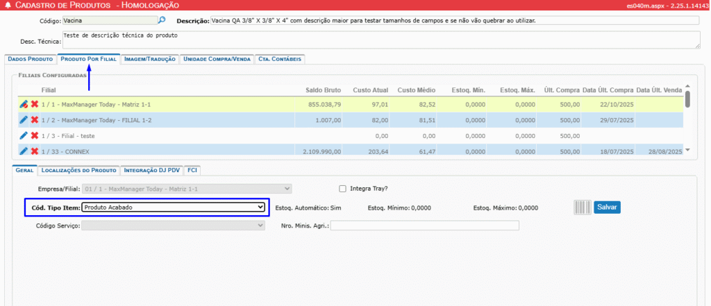 - Na aba Prroduto por Filial, confira o campo “Cod. Tipo Item”.