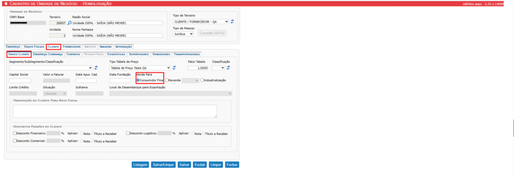 No ERP Max Manager acesse o menu Sistema > Cadastros Gerais > Básicos > Cadastro de Unidade de Negócio. Nesta tela, identifique o cliente/fornecedor cadastrado e verifique a configuração na aba: Cliente > Dados do Cliente > Venda Para → marcar a opção Consumidor Final.
