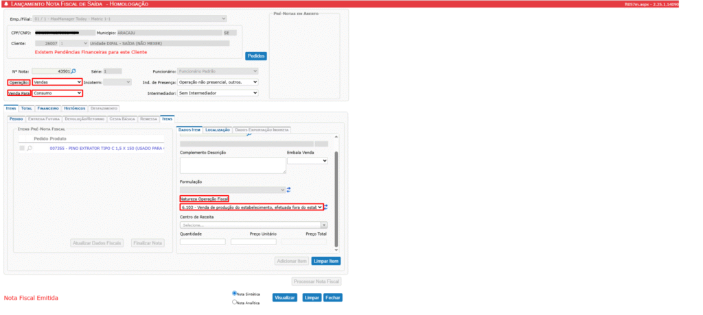 No ERP Max Manager acesse o menu Suprimentos > Faturamento > Notas de Saída > Lançamento Nota Fiscal de Saída. Após realizar as configurações anteriores, será possível lançar a Nota Fiscal de Saída para a operação interestadual que possui Diferencial de Alíquota (DIFAL).
