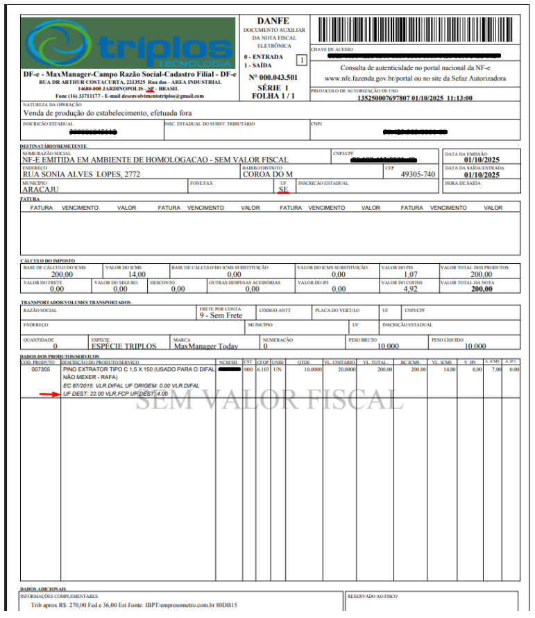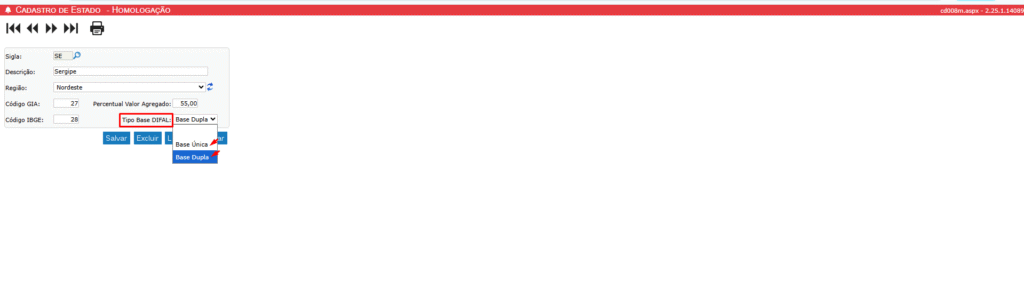 No exemplo abaixo: foi utilizado o Tipo de base DIFAL com Base Única – na operação interestadual Estado de Origem SP x Estado de Destino SE.