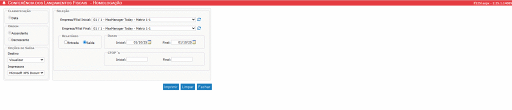 - Fiscal > Livros Fiscais > Relatórios > Auxiliares > Conferência dos Lançamentos Fiscais.