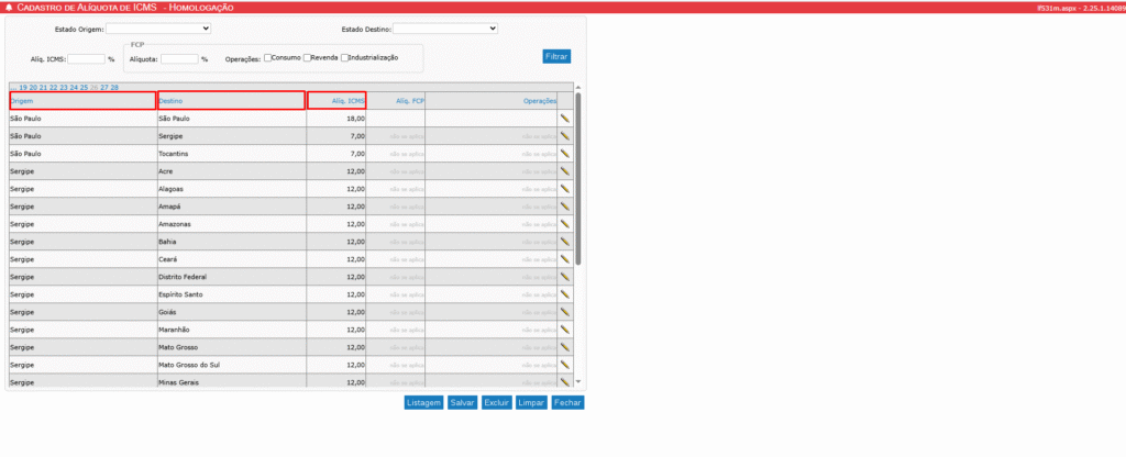 - Fiscal > Livros Fiscais > Cadastros > Cadastro de Alíquota de ICMS