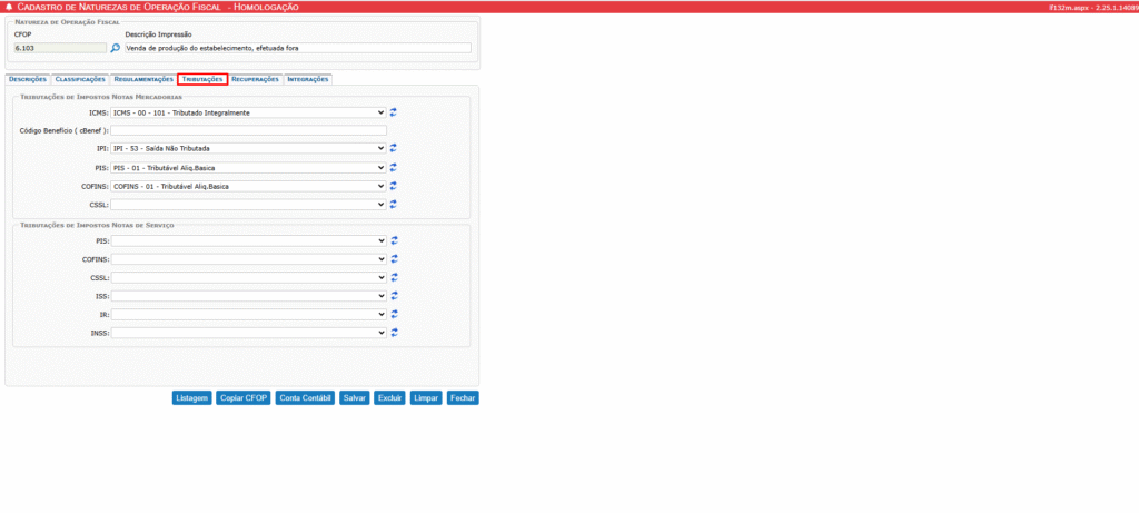- Fiscal > Livros Fiscais > Cadastros > CFOP s > Cadastro de Naturezas de Operação Fiscal