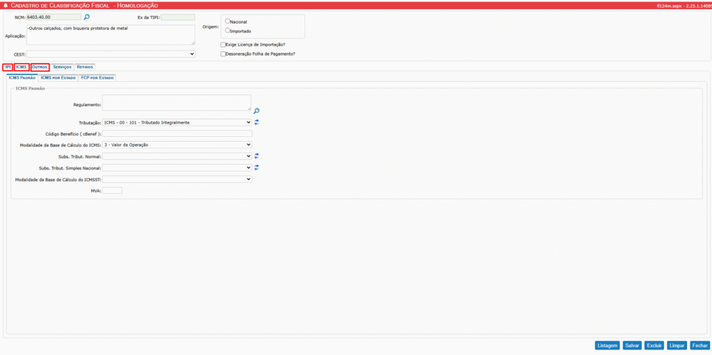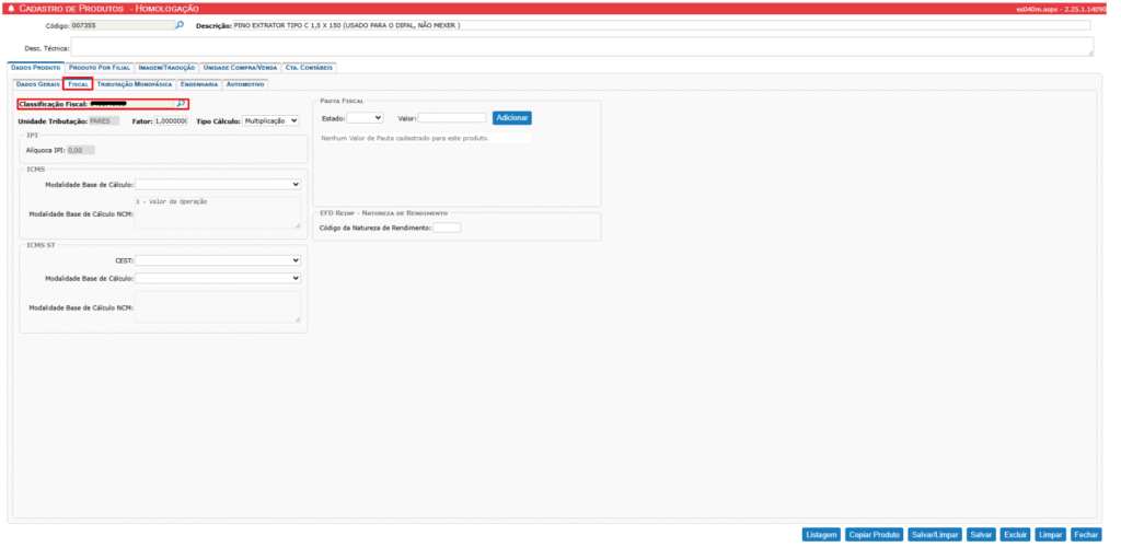 - Fiscal > Livros Fiscais > Cadastros > Cadastro de Classificação Fiscal