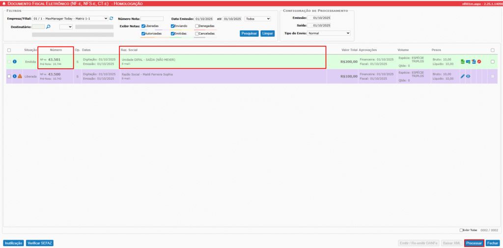 No ERP Max Manager acesse o menu Suprimentos > Emissor Documento Fiscal Eletrônico >Documento Fiscal Eletrônico (NF-e, NFS-e, CT-e). Nesta tela, clique no botão Processar para enviar a NF-e à SEFAZ. É possível visualizar a nota antes do envio para conferência.