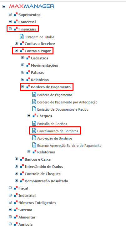 Para acessar a tela Cancelamento de Borderô, acesse a seguinte opção do menu: Financeira > Contas a Pagar > Bordero de Pagamento > Cancelamento de Borderos.