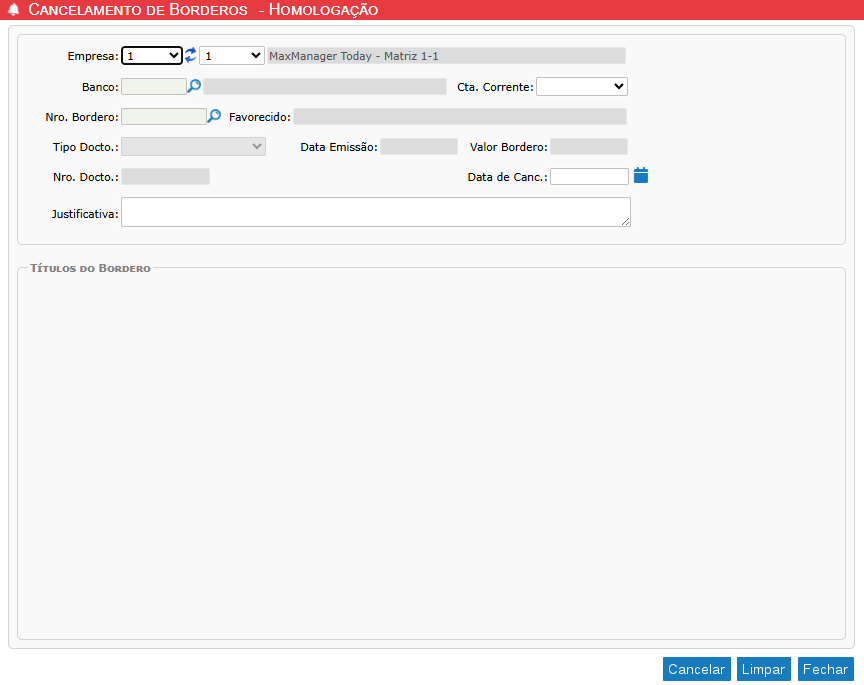 - Motivo do Cancelamento: Preencha o campo Justificativa: informando o motivo detalhado para o cancelamento deste borderô. (Nota: O preenchimento da Justificativa é um requisito obrigatório)