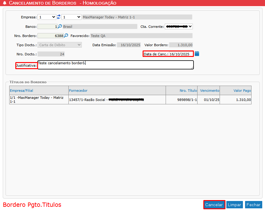 - Localização do Borderô: Após acessar a tela Cancelamento de Borderôs, informe o Nº. Borderô desejado. Os demais dados (Empresa, Banco, Favorecido, Títulos, etc.) serão carregados automaticamente a partir do borderô de pagamento previamente gerado.