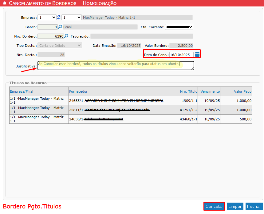 No entanto, ao cancelar o Borderô, todos os títulos vinculados serão automaticamente cancelados e retornarão ao status “Em Aberto”.