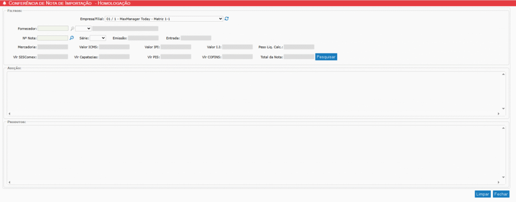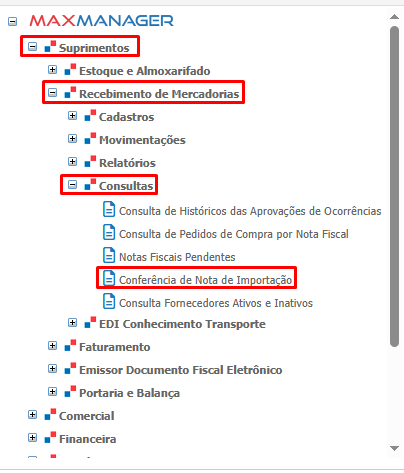 A rotina de conferência pode ser acessada através do seguinte menu: Suprimentos > Recebimento de Mercadorias > Consultas > Conferência de Nota de Importação
