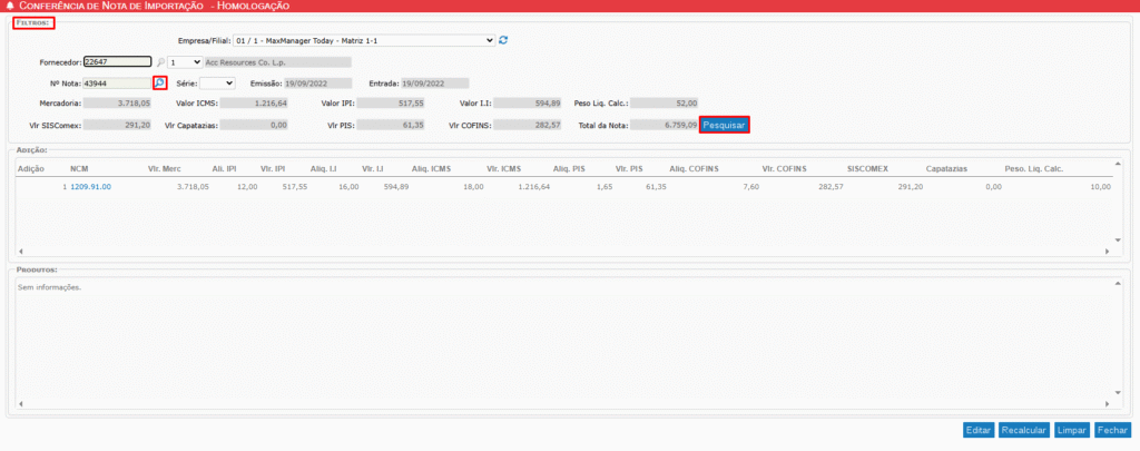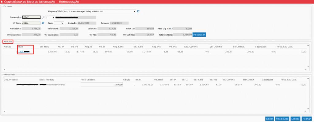 - Ao selecionar um NCM nesta grade (clicando sobre ele), o Grupo ‘Produtos’ será atualizado, exibindo apenas os itens relacionados àquele NCM.
