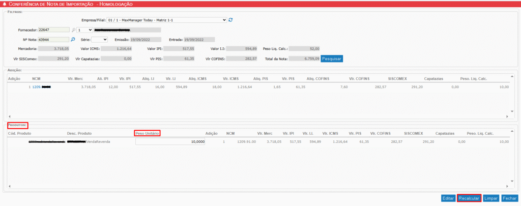 - Botão ‘Recalcular’: Deve ser utilizado para recalcular os pesos totais da nota após qualquer alteração nos pesos dos itens.