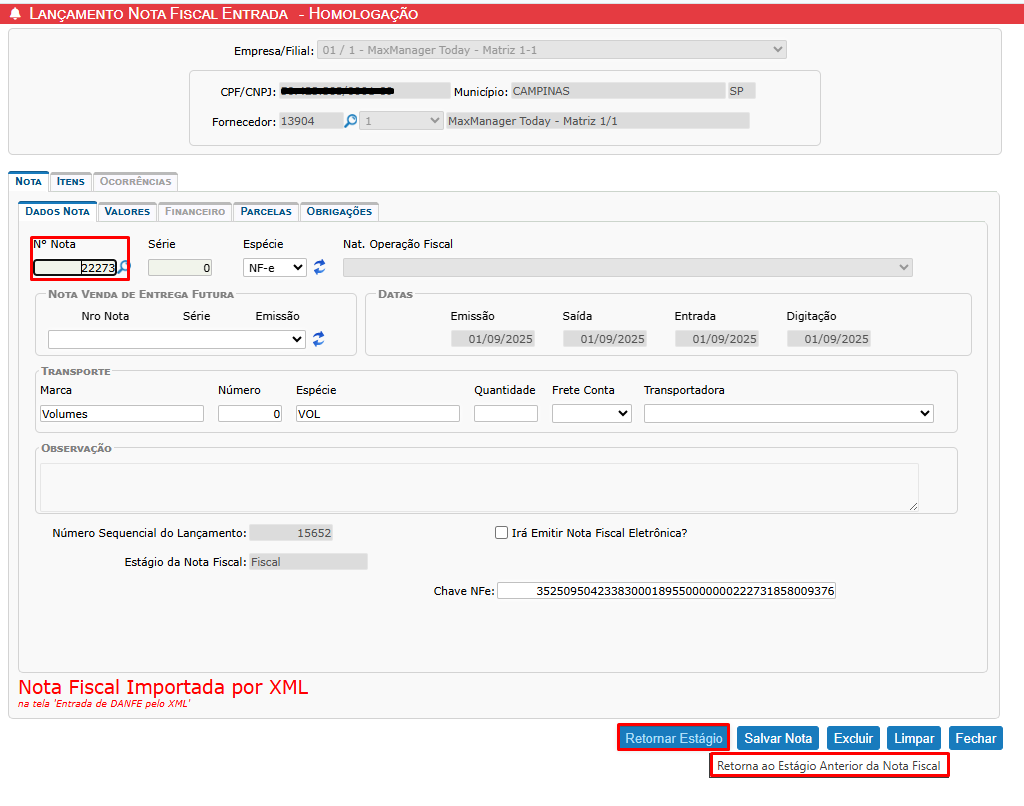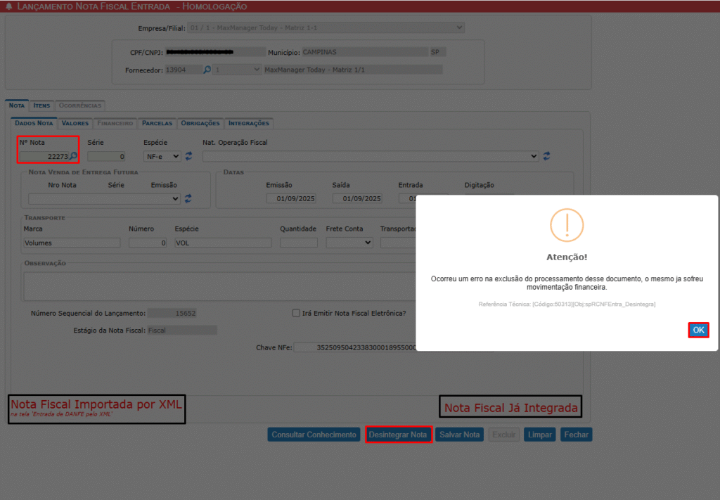 Com a baixa financeira cancelada, o usuário pode retornar à tela Lançamento Nota Fiscal Entrada e prosseguir com a desintegração da NF.