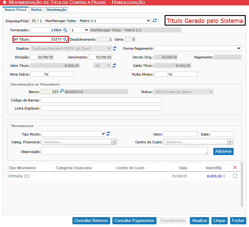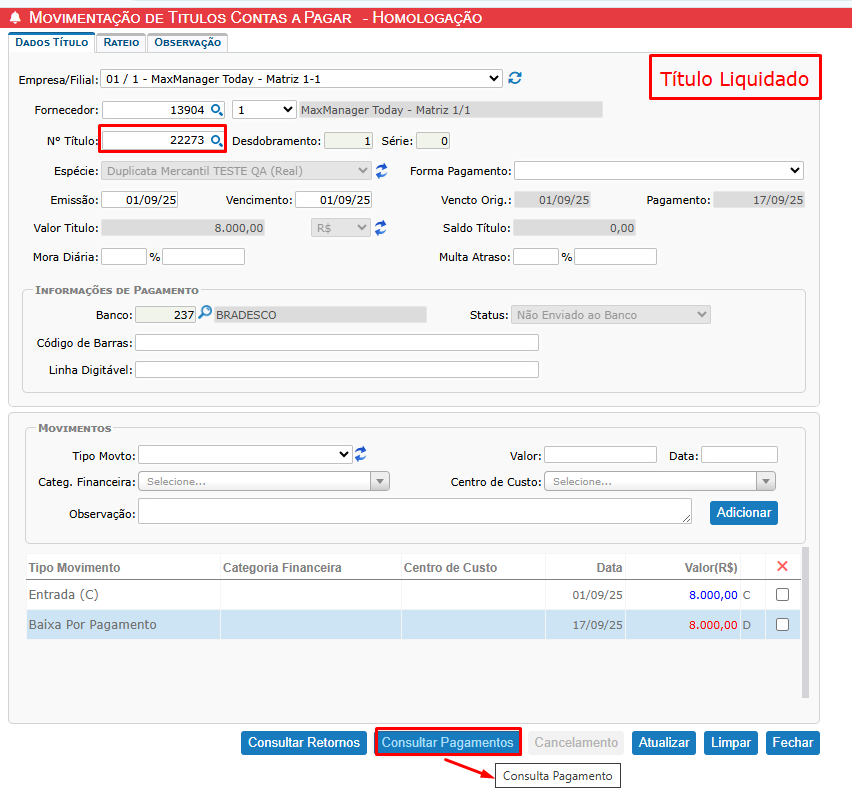 - Retorno: Retorne à tela Movimentação de Títulos Contas a Pagar.
