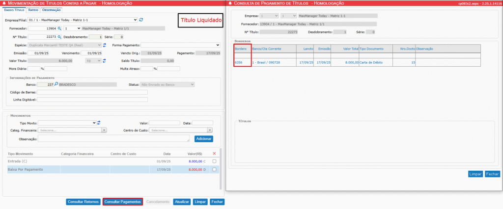 - Consulta de Pagamento: Clique no botão “Consultar Pagamento”. Este passo identificará se existe um Nº. de Borderô gerado para a liquidação desse título.