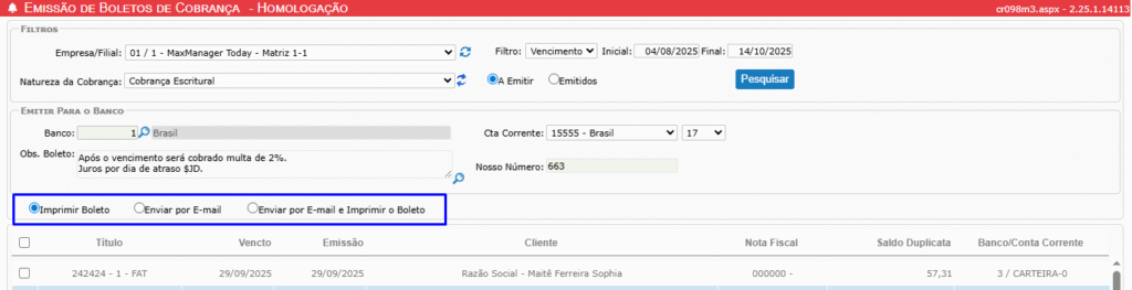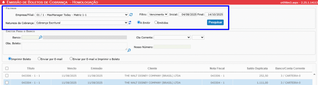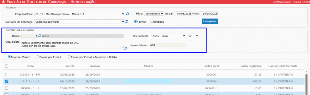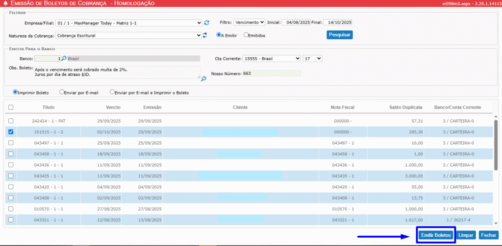📍 Financeira > Contas a Receber > Movimentações > Emissão de Boletos de Cobrança