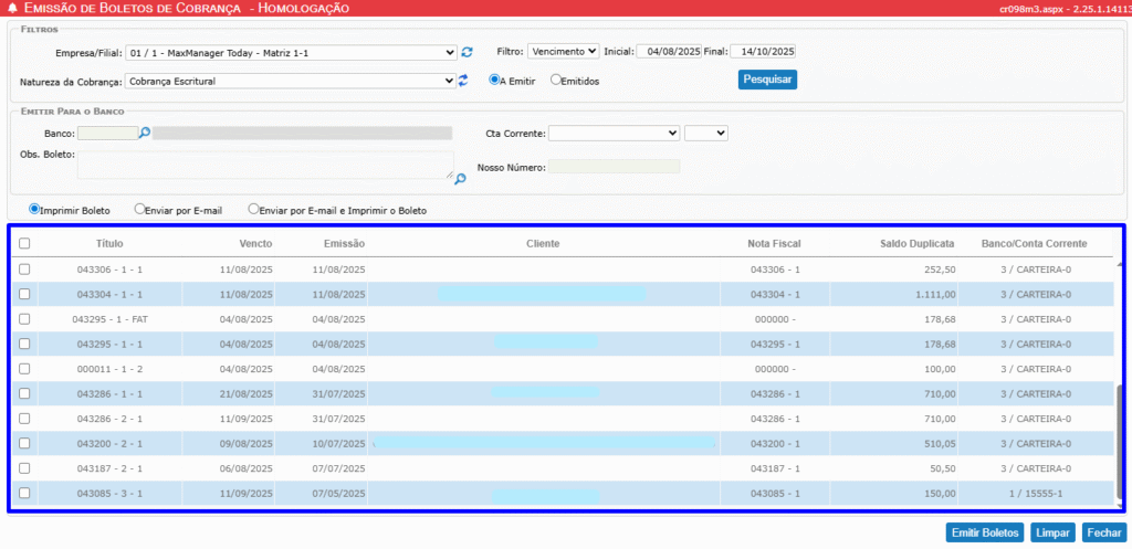 - Os títulos encontrados serão listados na grade. Selecione os títulos que deseja emitir boletos.
