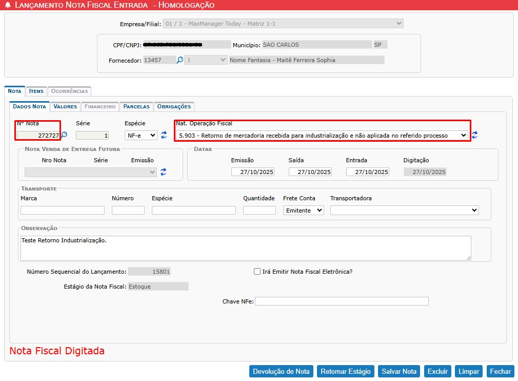 O lançamento deve ser feito como uma nota de retorno de industrialização comum, porém com as seguintes características: