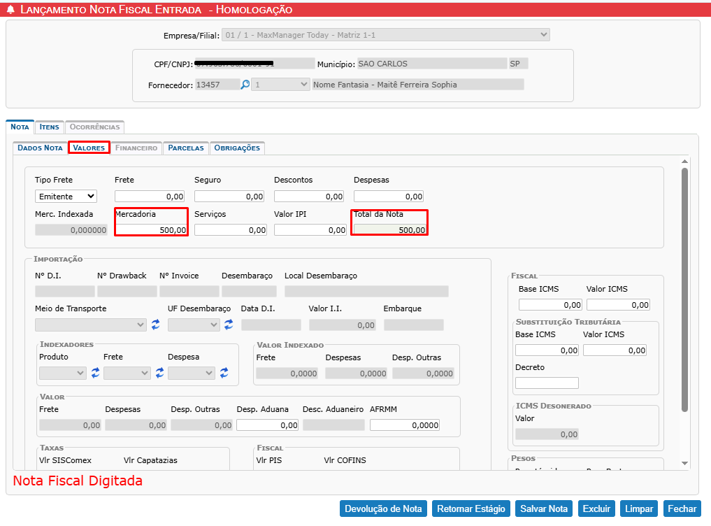 - Campos Requeridos: Preencha apenas os campos Valor da Mercadoria e Valor Total da Nota.
