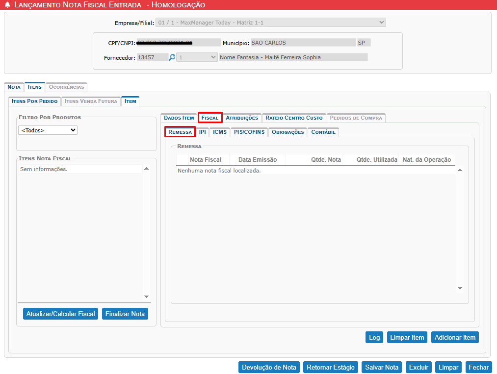 - Acesso: Navegue até a tela de Lançamento de Nota Fiscal Entrada.
