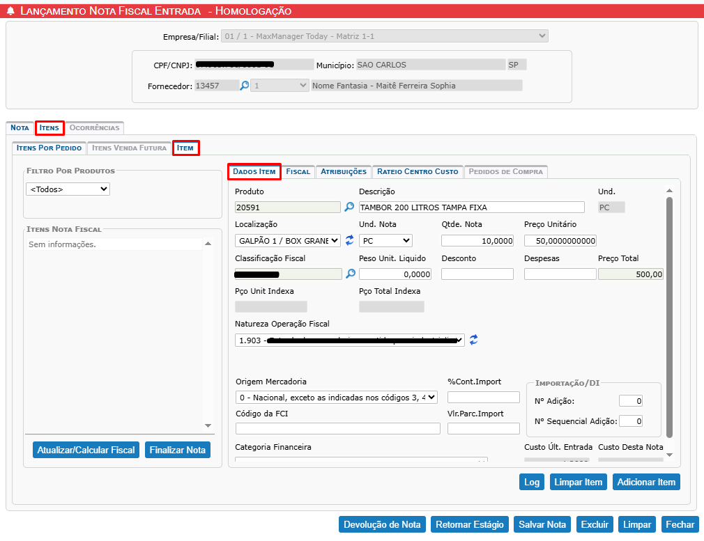 Na aba de Itens, lance cada produto que será liquidado do saldo do estoque em poder do terceiro (industrializador):