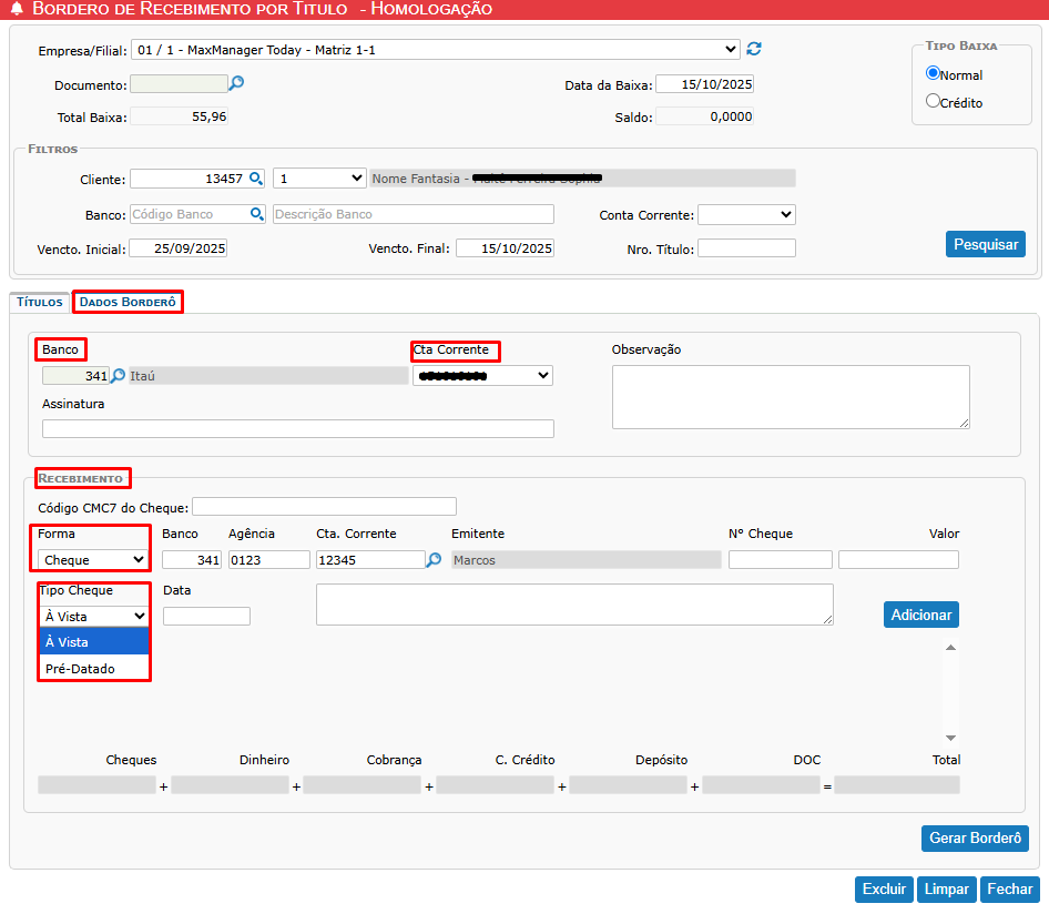 - Recomendação: É aconselhável utilizar uma conta corrente específica que represente seu Caixa ou Cofre para o primeiro armazenamento dos cheques. Se os cheques forem recebidos diretamente no caixa, esta conta deve ser selecionada para posterior transferência dos valores para outras contas correntes, se necessário.Lançando um bordero, seja por título ou por valor, e se você esta recebendo estes títulos com cheques do seu próprio cliente ou de terceiros, você poderá informar os dados dos cheques para controlá-los pelo MaxManager.