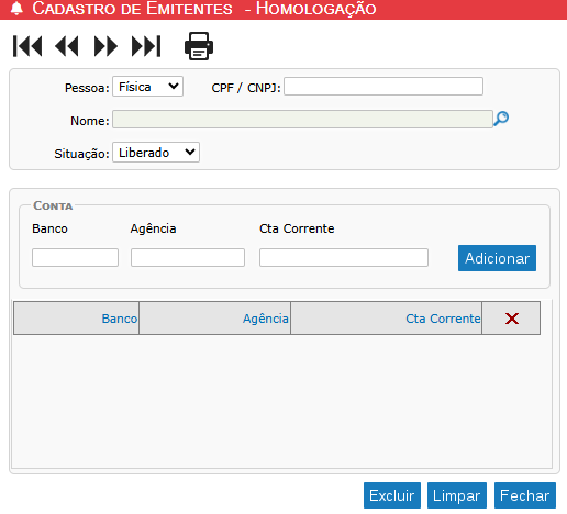 Caso seja o primeiro recebimento de um cheque proveniente do emitente e da conta corrente informados, precisará realizar o cadastrado na tela de Cadastro de Emitente.
