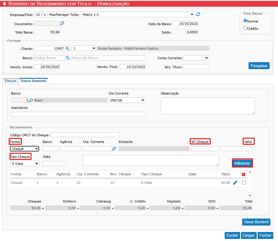 - Após incluir todas as formas de recebimento (cheques e outras, se houver), clique no botão Gerar Borderô.